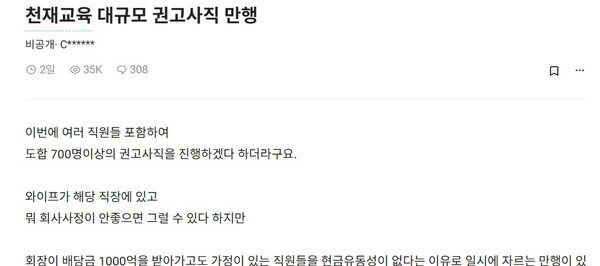 24일 직장인 익명게시판(블라인드)에 따르면 천재교육은 '권고이직'이라는 명목으로 실업급여나 위로금조차 지급하지 않고 대규모 권고사직을 진행 중인 것으로 전해졌다. 회사 측이 오는 5월까지 도합 700명 이상의 직원을 권고사직 처리할 것이란 얘기가 돌고 있다.