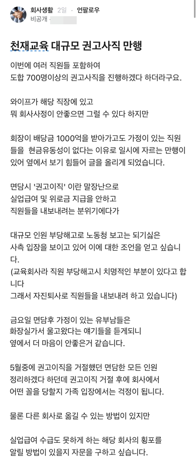 해당 글을 올린 익명의 작성자는 “천재교육 회장이 배당금 1000억을 받아가고도 가정이 있는 직원들을 현금유동성이 없다는 이유로 일시에 자르는 만행이 있어 옆에서 보기 힘들어 글을 올리게 됐다”면서 “면담시 ‘권고이직’이란 말장난으로 실업급여 및 위로금 지급을 안하고 직원들을 내보내려는 분위기”라고 증언했다.