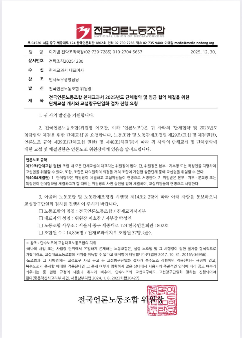 12월 30일 전국언론노동조합 천재교과서 2025년도 단체협약 및 임금 협약 체결을 위한 단체교섭 개시와 교섭창구단일화 절차 진행 요청 공문을 천재교과서에 전달하였습니다.